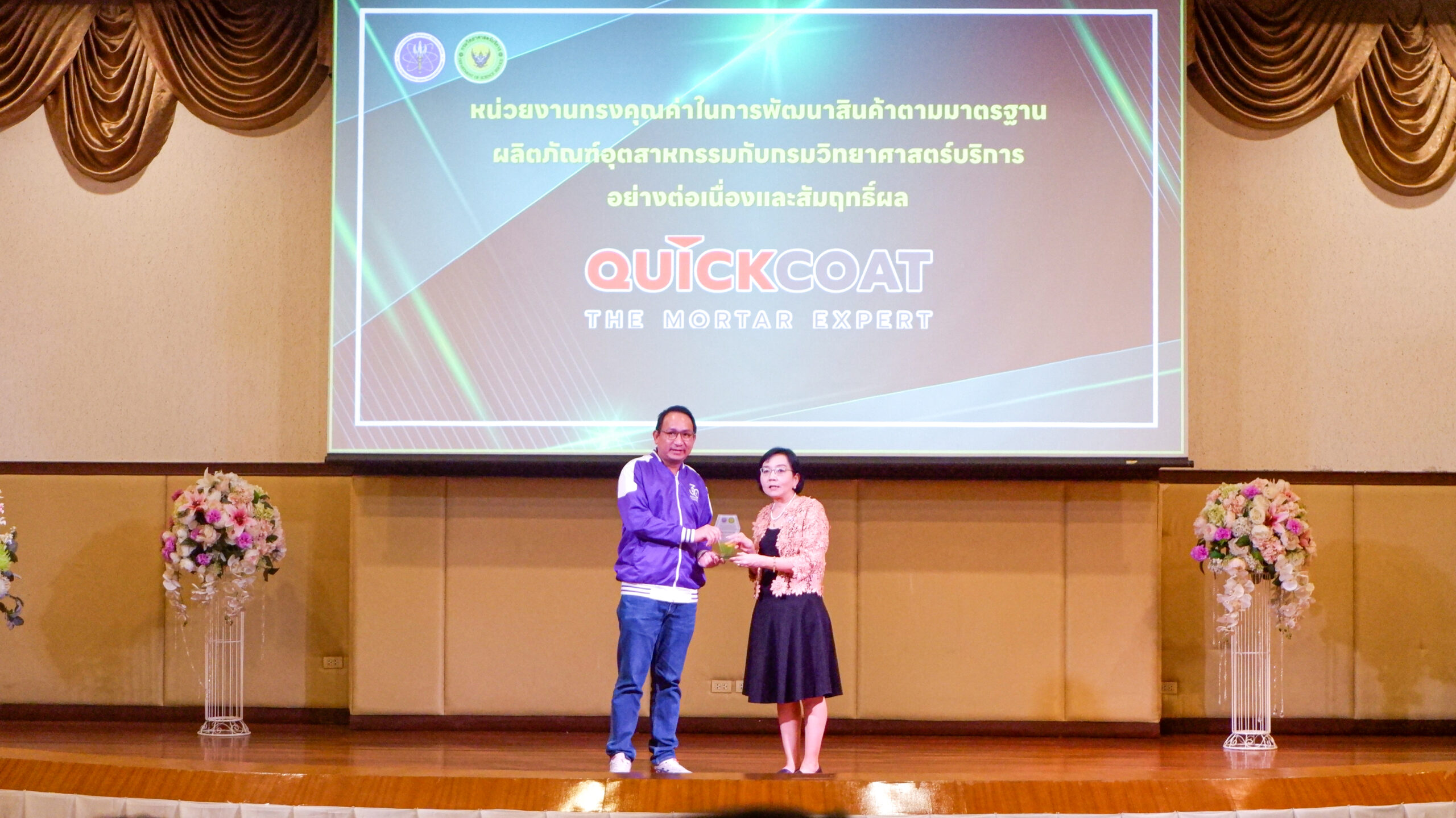 ในวันที่ 16 กุมภาพันธ์ 2567 บริษัท ควิกโคท โปรดักส์ จำกัด ผู้ผลิตและจัดจำหน่ายสินค้าภายใต้แบรนด์ ปูนลูกดิ่ง ปูนจิงโจ้ ร่วมเข้ารับรางวัลโล่เกียรติคุณ ประเภทที่ 2 รางวัลหน่วยงานทรงคุณค่าในการพัฒนาสินค้าตามมาตรฐาน ผลิตภัณฑ์อุตสาหกรรมกับกรมวิทยาศาสตร์บริการอย่างต่อเนื่องและสัมฤทธิ์ผล โดยคุณธีระ สุวรรณวนิช ผู้อำนวยการฝ่ายการผลิต เป็นตัวแทนรับมอบรางวัล ในครั้งนี้ ซึ่งได้รับเกียรติจากท่าน พจมาน ท่าจีน รองอธิบดีกรมวิทยาศาสตร์บริการ เป็นผู้มอบรางวัล