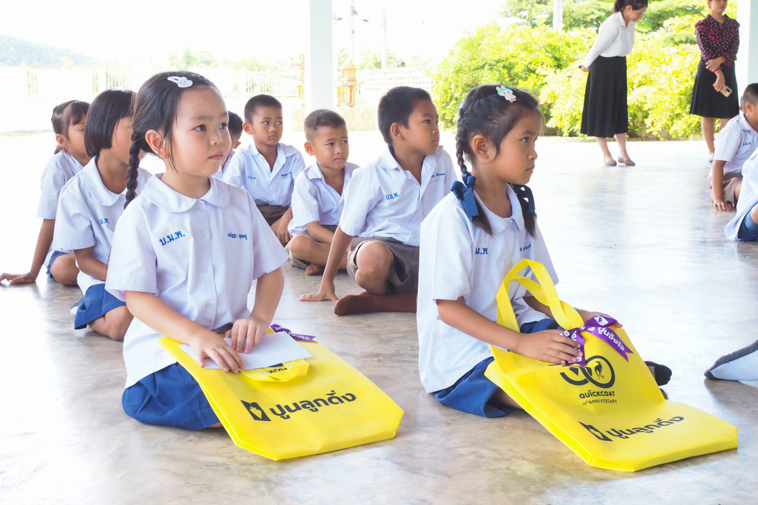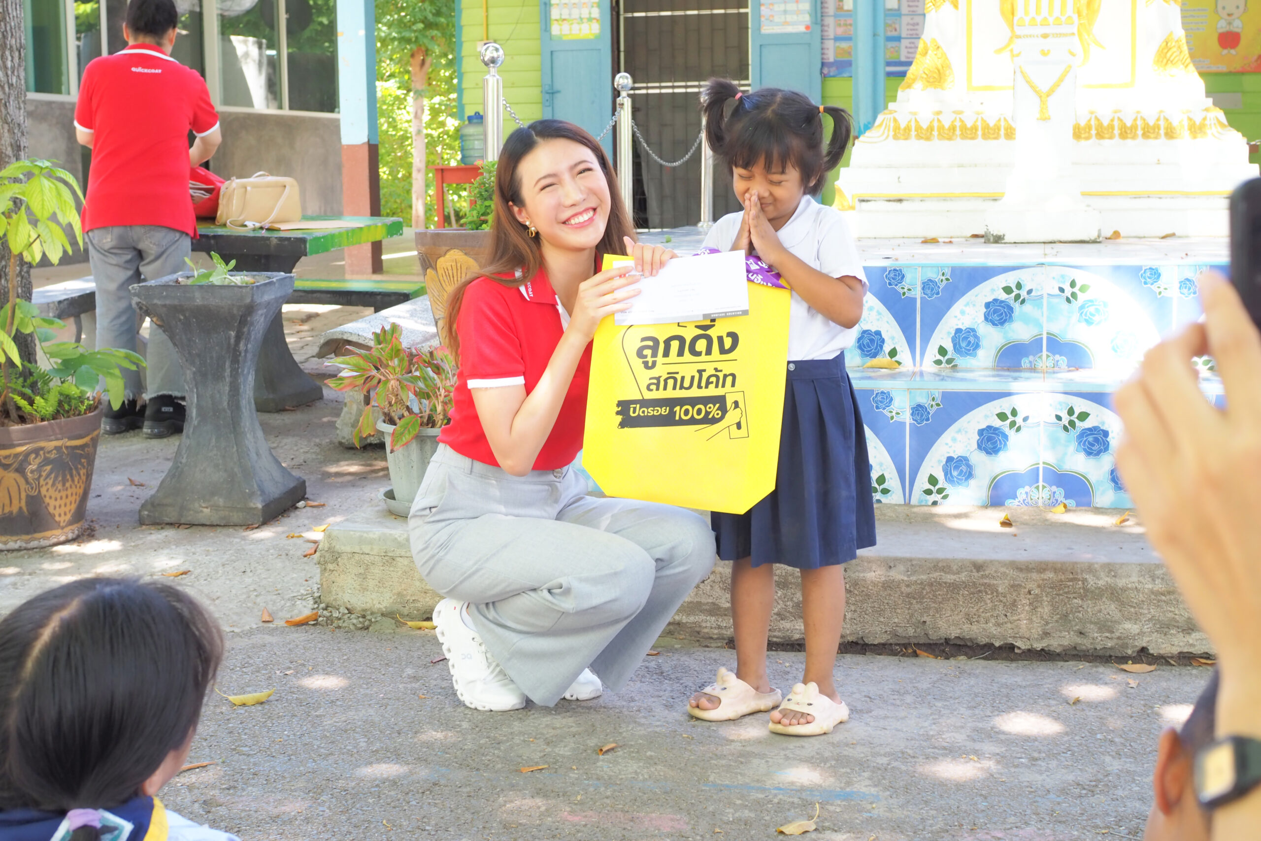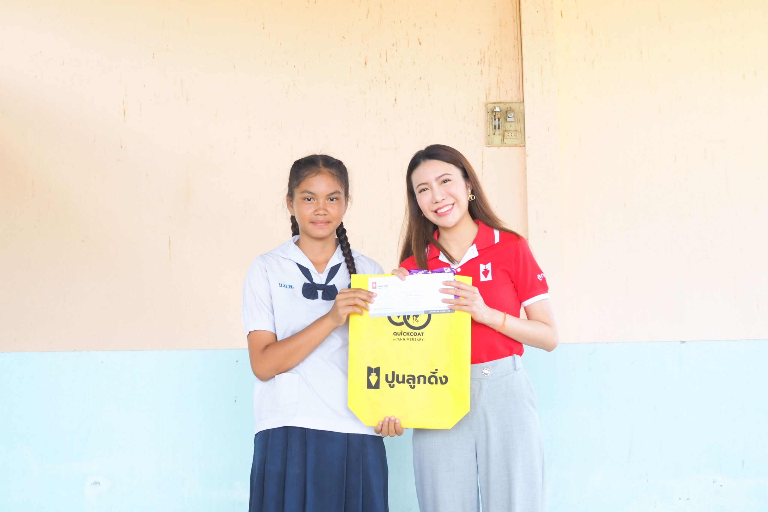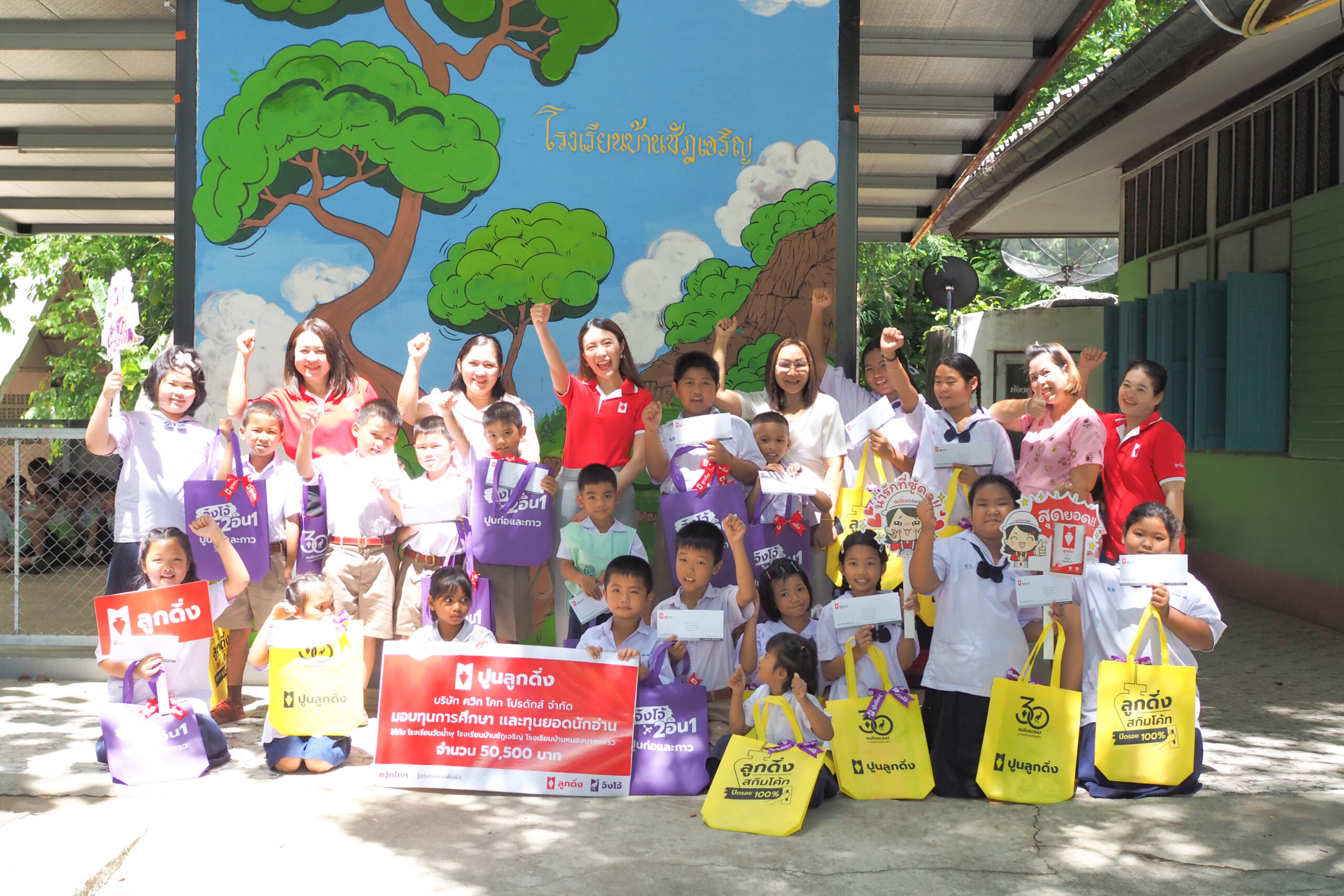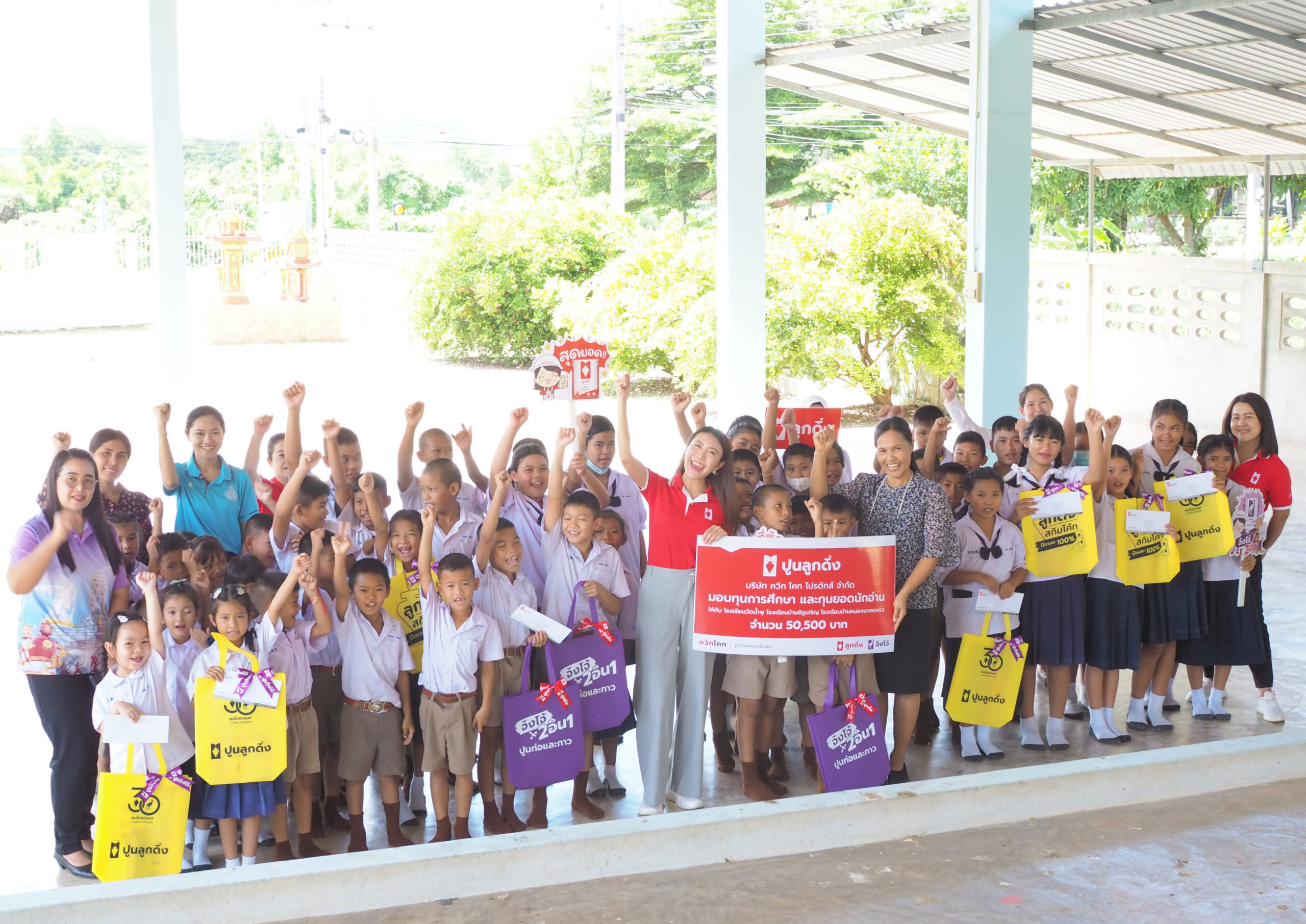 คุณฟ้าใส สิริวัฒกานนท์ ผู้อำนวยการฝ่ายการตลาด และคุณธีระ สุวรรณวนิช ผู้อำนวยการฝ่ายผลิต เป็นตัวแทน บริษัท ควิกโคท โปรดักส์ จำกัด มอบเงินสนับสนุนทุนการศึกษา มูลค่ากว่า 270,500 บาท ให้กับโรงเรียนในพื้นที่ จ.ราชบุรี ซึ่งเป็นถิ่นกำเนิดของปูนลูกดิ่ง ปูนจิงโจ้ โดยได้มอบทุนการศึกษาสนับสนุนเป็นประจำอย่างต่อเนื่อง ปีนี้นับเป็นปีที่ 22 แล้ว เนื่องด้วยตระหนักถึงความสำคัญของการศึกษา เป็นการมอบโอกาสที่ดีให้กับเด็กๆ ทุกคน ให้มีกำลังใจในการเรียน เพราะเด็ก คืออนาคตของชาติ โดยครั้งนี้ได้มอบทุนการศึกษา รวม 6 โรงเรียน ดังนี้
