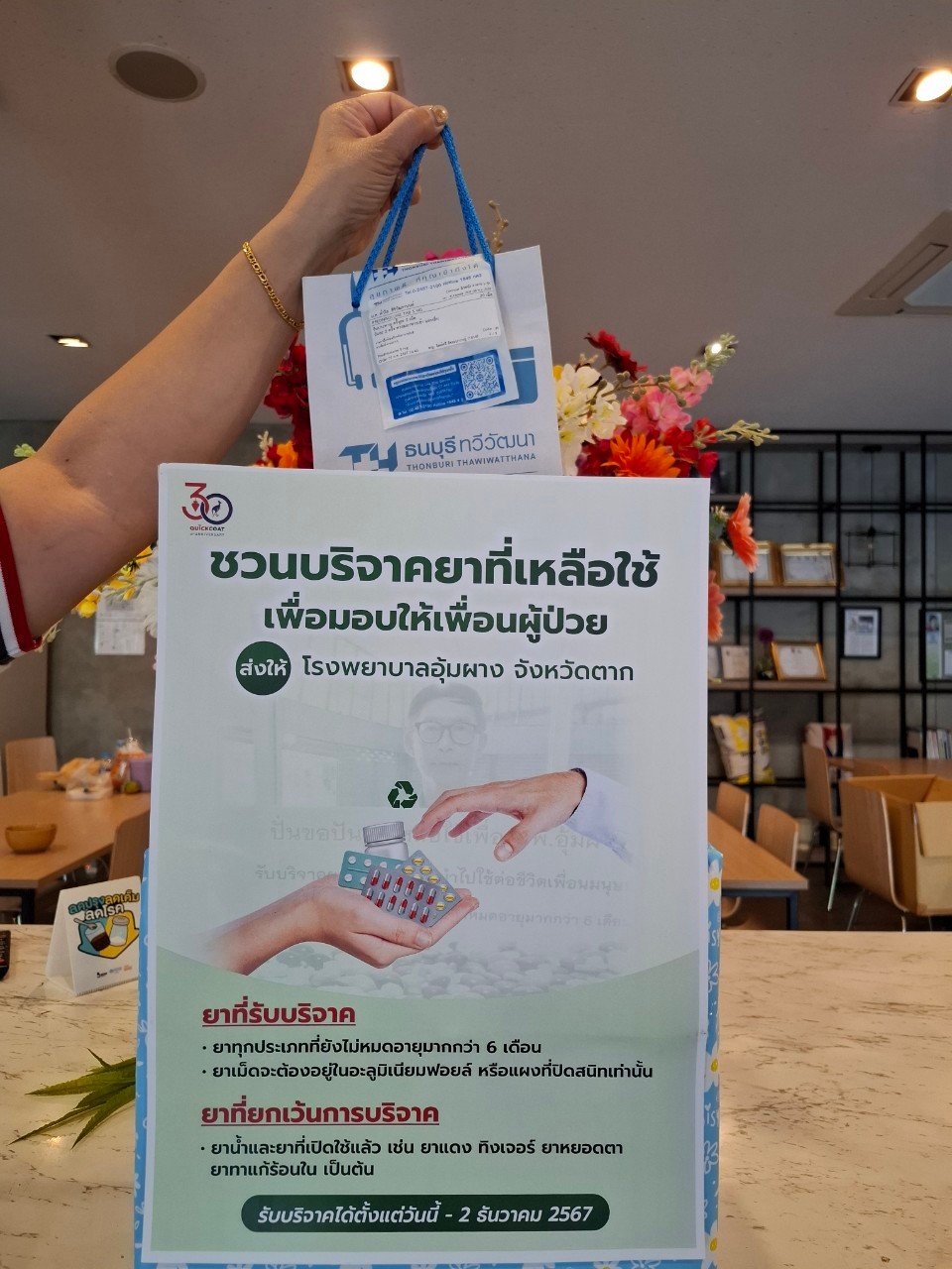 ซึ่งทางโรงพยาบาลอยู่ไม่ ไกลจากชายแดนไทย-พม่า มีผู้ป่วยจำนวนมากที่มีความต้ องการยารักษาโรค แต่ไม่มีสิทธิในหลักประกันสุ ขภาพ ยาเหลือใช้นี้จะเป็นประโยชน์อย่ างมากกับผู้ป่วยในพื้นที่ห่ างไกล