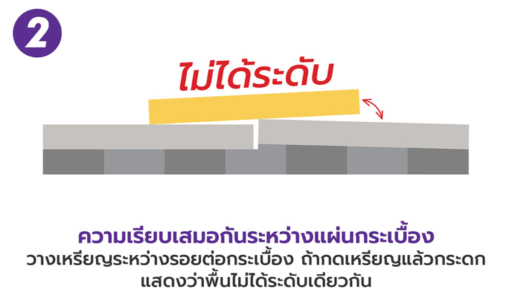 - แต่ถ้าเหรียญกระดกหรือโยก แสดงว่าพื้นมี “ระดับไม่เท่ากัน” ระหว่างแผ่น