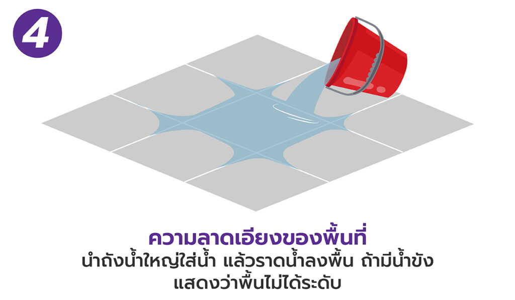 - แต่ถ้าน้ำหยุดนิ่ง หรือขังเฉพาะบางจุด แปลว่าพื้นไม่ได้ระดับ หรือมีแอ่งที่อาจเกิดปัญหาน้ำขังในภายหลัง