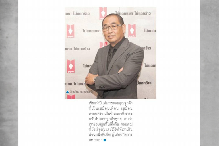 “แผนการตลาดแน่นอนว่าต้องมีการปรับให้เข้มข้นขึ้น ช่วงปีที่ผ่านมาเราสะสมกระสุนไว้รอมาใช้ในปีนี้ในเวลาที่กําลังการผลิตเราเพียงพอและพร้อมเข้าแข่งขันเชิงรุกมากขึ้น ส่วนสําคัญที่สุดอีกส่วนหนึ่งคือตัวแทนจําหน่าย ที่ในปี 2562 ขอเรียกว่าปีแห่งการขอบคุณลูกค้าที่เป็นเสมือนเพื่อน เสมือนครอบครัว เป็นช่วงเวลาที่เราจะกลับไปบอกลูกค้าทุกๆคนว่าเราขอบคุณที่ไม่ทิ้งกัน ขอบคุณที่ยังเชื่อมั่นและไว้ใจให้เราเป็นส่วนหนึ่งที่เคียงคู่ไปกับกิจการเสมอมา”