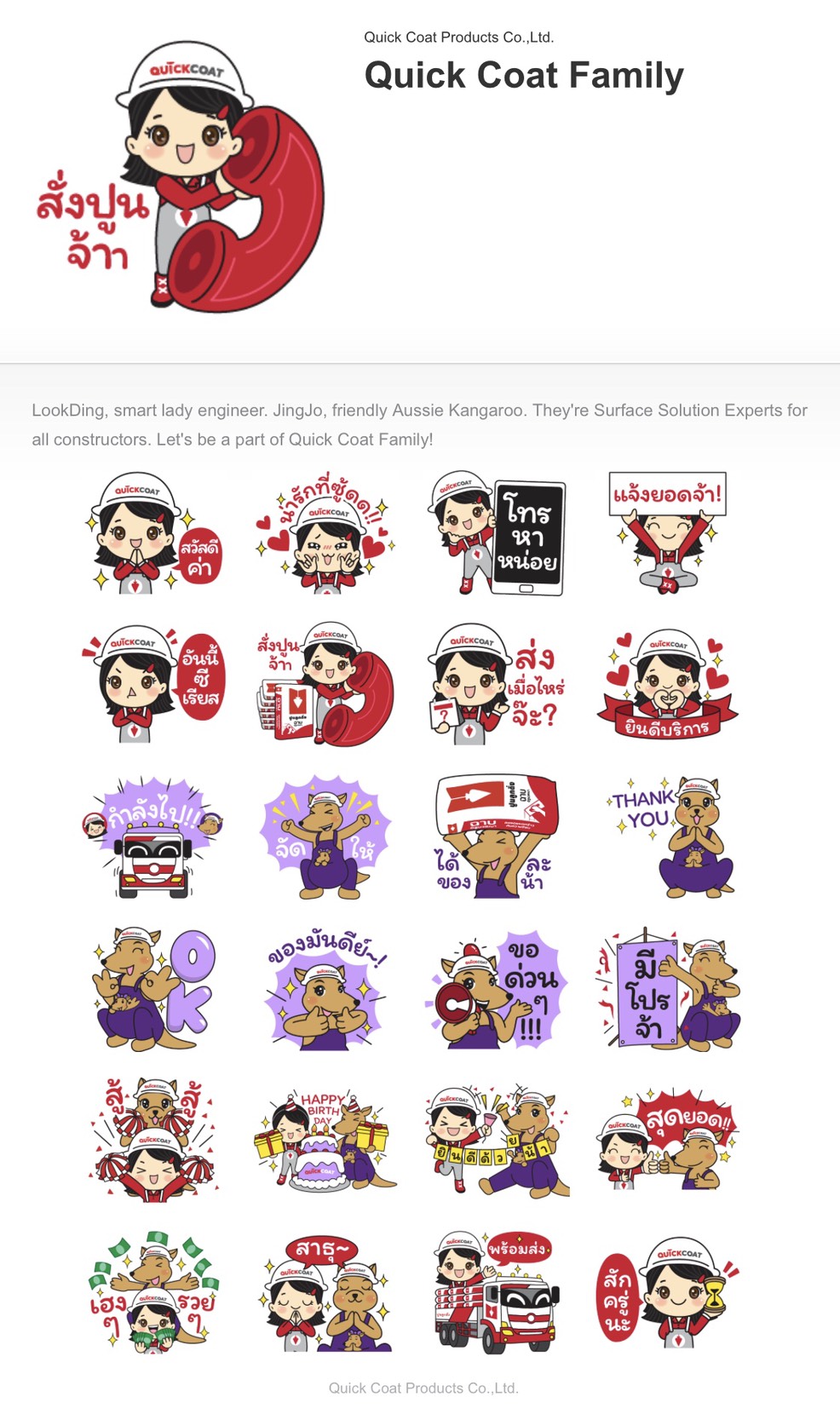 ปูนลูกดิ่ง…มีไลน์สติ๊กเกอร์ละน้าา ชื่อ “Quick Coat Family” หรือ “ครอบครัวควิกโคท” ดาวน์โหลดได้แล้วที่ Line Stickers Shop เพียง 30 บาท (50 coins) มีพี่ลูกดิ่งกับน้องจิงโจ้มาฝากทั้งหมด 24 ตัว!! ลิงค์ดาวน์โหลด>>[Quick Coat Family] https://line.me/S/sticker/12004963?lang=en&ref=lsh_stickerDetai