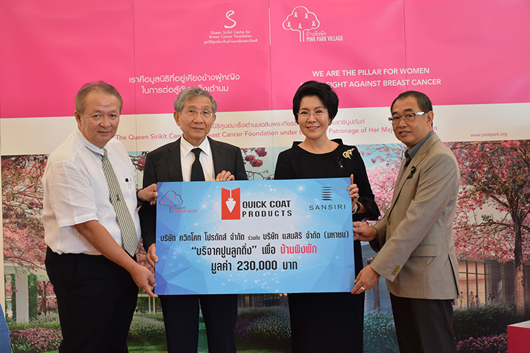 บริษัท ควิกโคท โปรดักส์ จำกัด ร่วมกับ บริษัท แสนสิริ จำกัด (มหาชน) ในการร่วมสนับสนุนปูนก่อตราจิงโจ้ ปูนฉาบตราลูกดิ่ง และทุนทรัพย์ แก่มูลนิธิศูนย์มะเร็งเต้านมเฉลิมพระเกียรติ เพื่อสมทบทุนสร้างบ้านพิงพัก ศูนย์ดูแลผู้ป่วยและศูนย์วินิจฉัยโรคมะเร็งเต้านมอย่างครบวงจรโดยไม่แสวงหาผลกำไร โดยมี นพ.กฤษณ์ จาฏามระ ประธานโครงการ ให้้เกียรติเป็นผู้รับมอบ