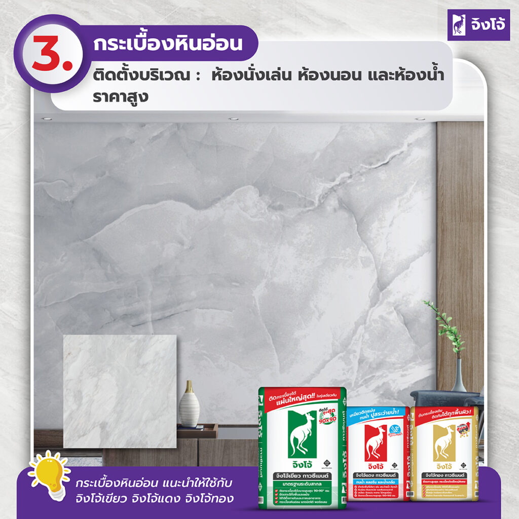 กระเบื้องหินอ่อน วัสดุที่ให้ความหรูหราและสง่างาม ด้วยลวดลายธรรมชาติที่ไม่ซ้ำกันในแต่ละแผ่น นิยมใช้ในห้องนั่งเล่น ห้องนอน หรือห้องน้ำ เพื่อเพิ่มบรรยากาศพิเศษ แต่มีข้อควรระวังคือราคาสูงและค่อนข้างเปราะบาง จึงต้องใช้การติดตั้งที่พิถีพิถันและเลือกปูนกาวซีเมนต์ที่ยึดเกาะสูง เพื่อเสริมความแข็งแรงและยืดอายุการใช้งาน